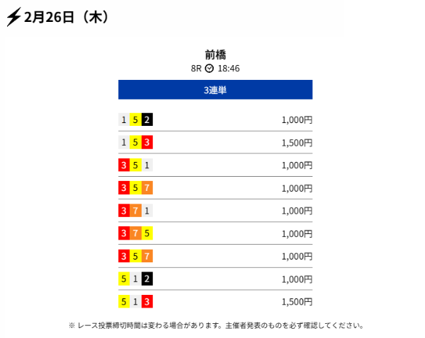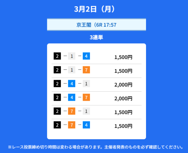 2月17日の無料予想では、オッズ135.1倍を的中したのが凄かったです。