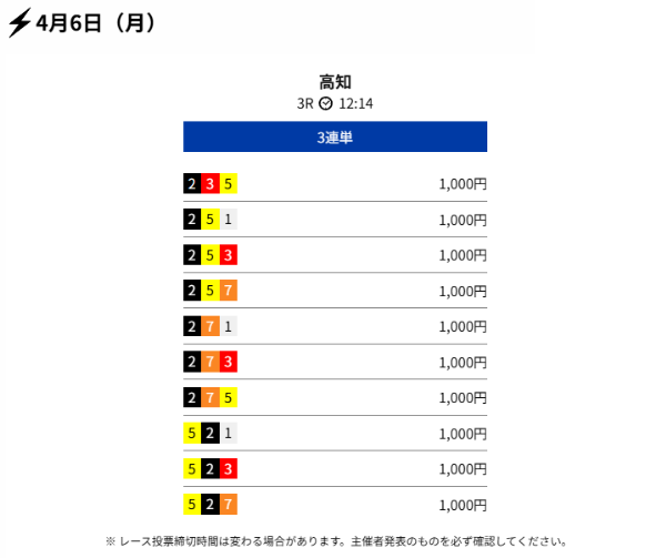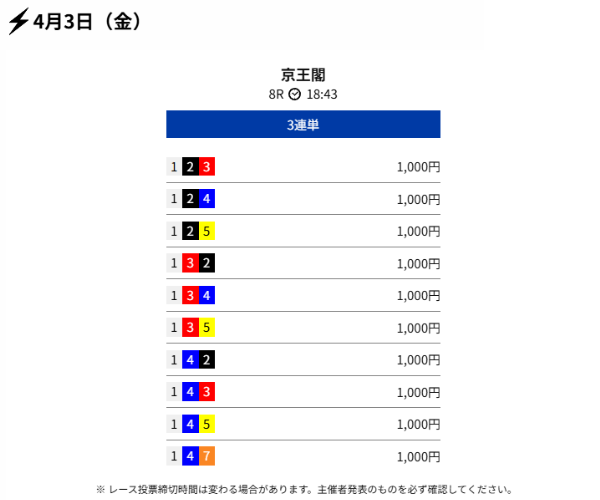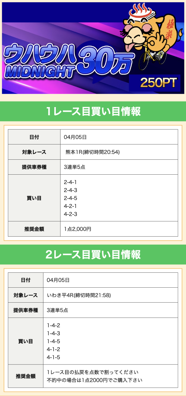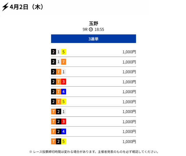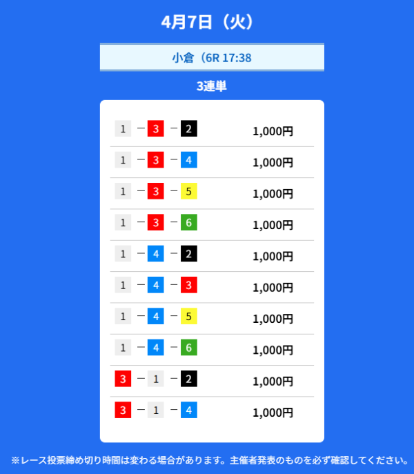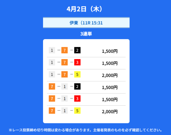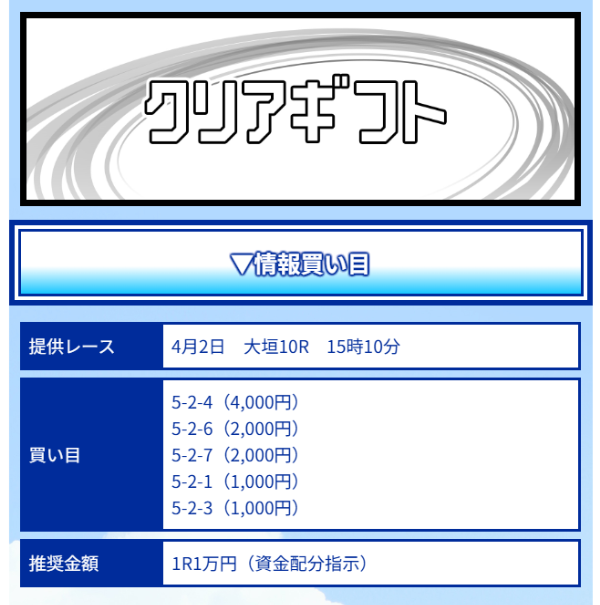 クリアレーサーは4月3日の有料予想で約68万円のコロガシ成功を出していました。