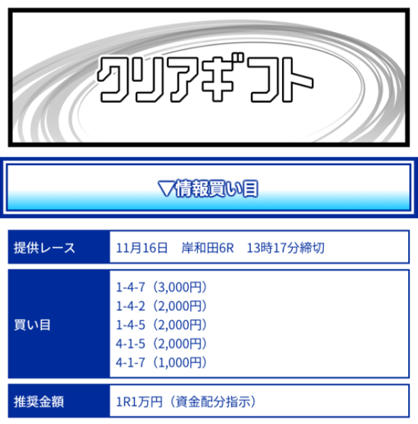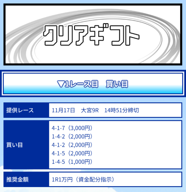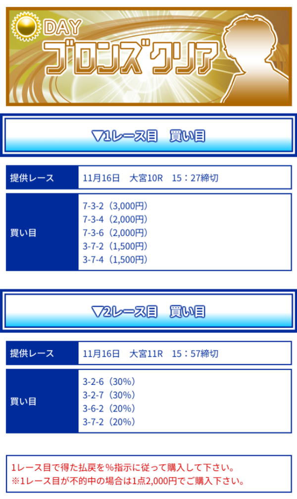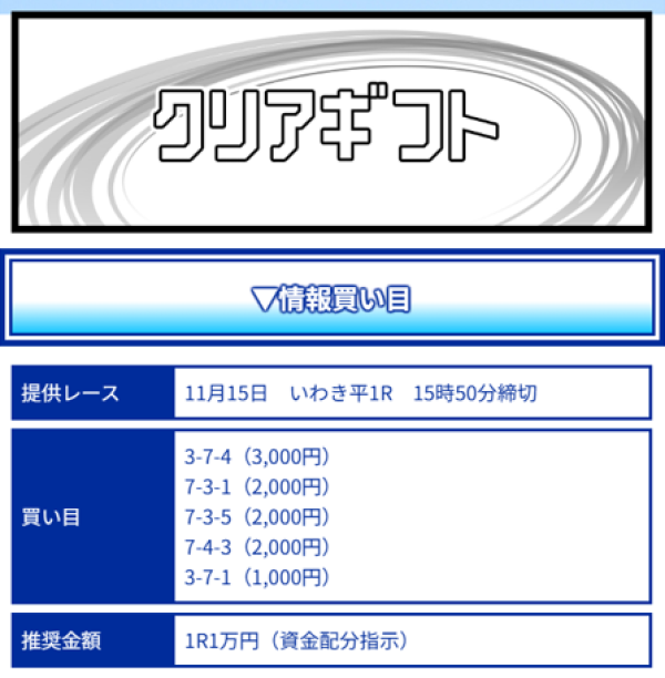 クローバーは、情報料3万円、目標金額40万円の2レースコロガシのプランですね。