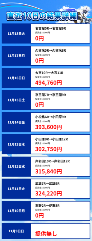 例えば、会員ページには、プランごとに直近10日間の結果が載っていました。