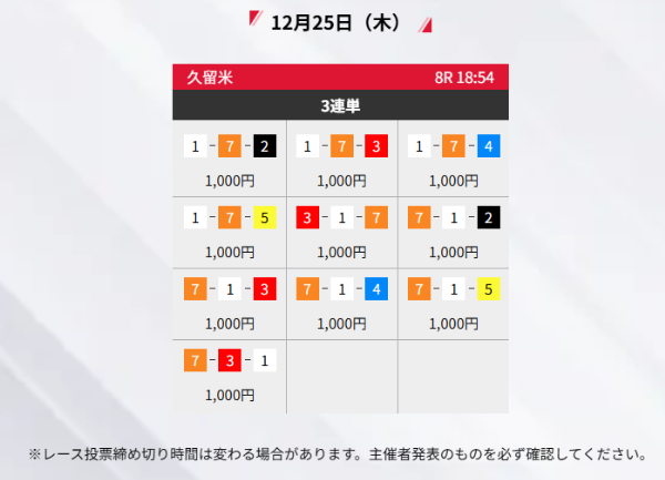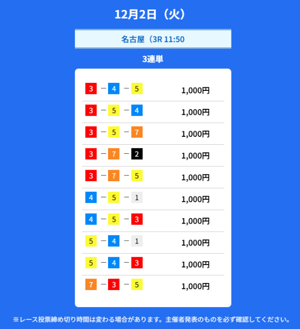 | 12月2日 | 昼 | 10,000円 | 7,000円 | 7.0倍 | 買い目を見る |
