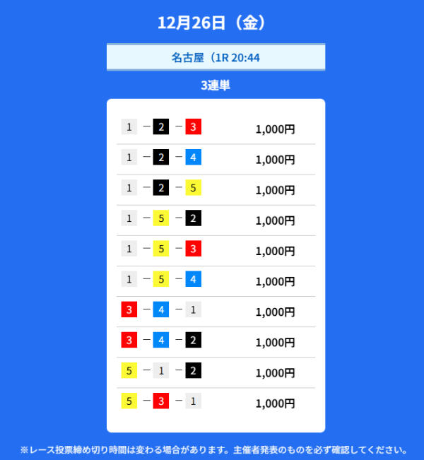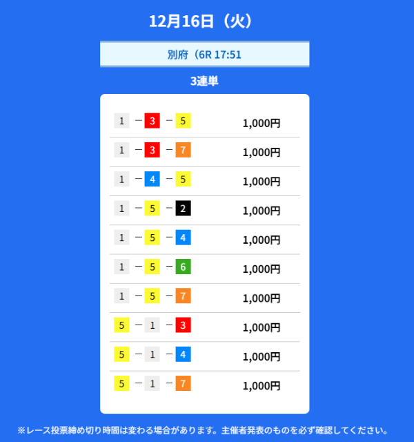 | 12月3日 | 夜 | 10,000円 | 16,100円 | 16.1倍 | 買い目を見る |