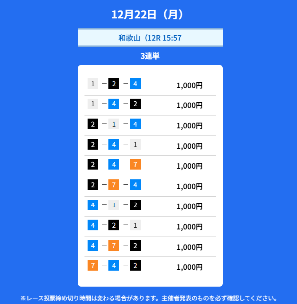 | 12月22日 | 5,000円 | 3,600円 | 3.6倍 | 買い目を見る |