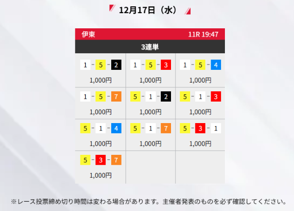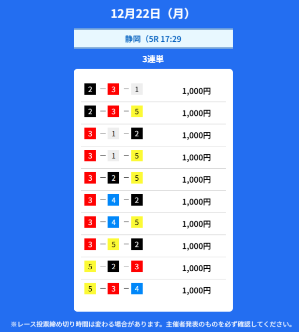 | 12月17日 | 深夜 | 10,000円 | 5,500円 | 5.5倍 | 買い目を見る |