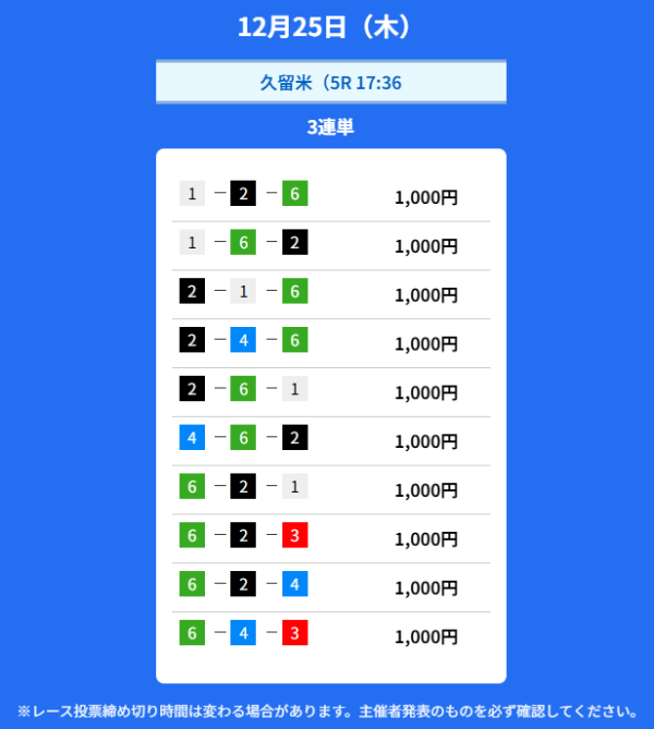 | 12月17日 | 昼 | 10,000円 | 12,000円 | 12.0倍 | 買い目を見る |