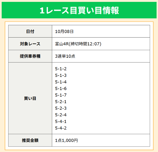 また、推奨金額は1点2,000円なので、車券代の合計は2,000円×5=10,000円となりますね。