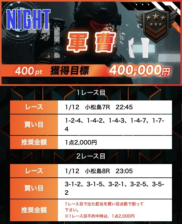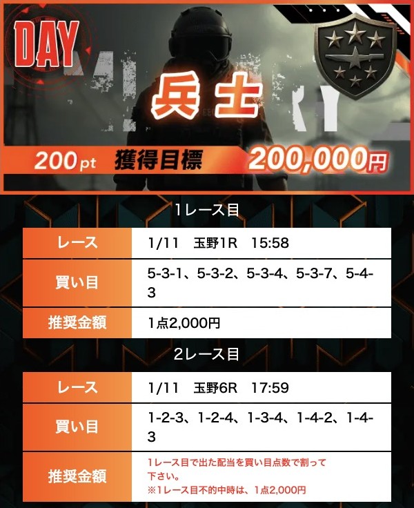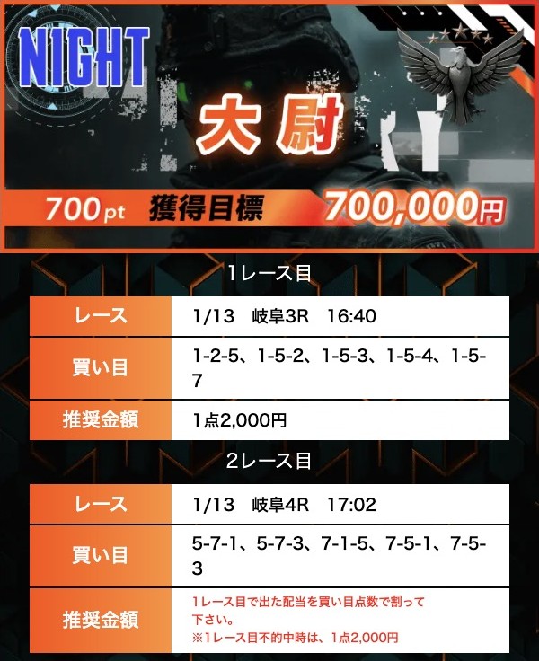 大尉は、情報料7万円、獲得目標70万円の2レースコロガシのプランですね。