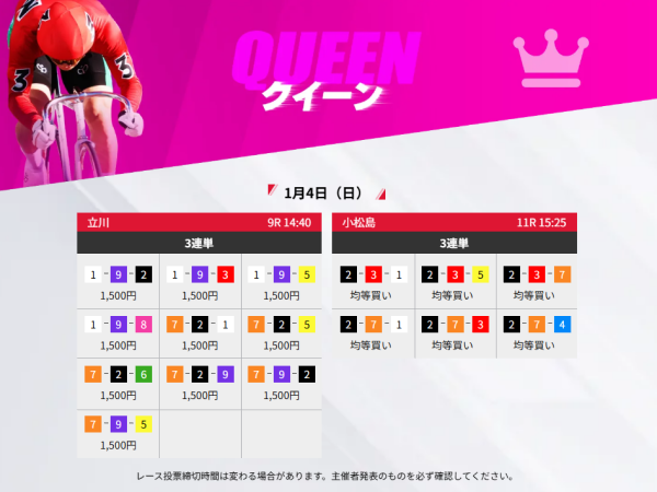 | クイーン | 1月4日 | 709,920円 | 1036% | 54.6倍→52.2倍 | 画像 |